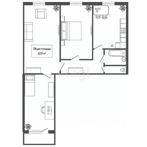 - Общая площадь: 58.9 м2