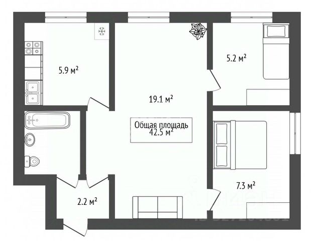 - Общая площадь 43.5 м2