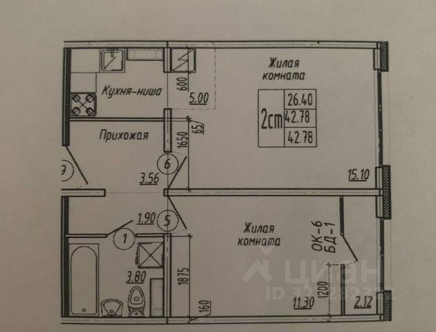 - Общая площадь: 42.8 м2