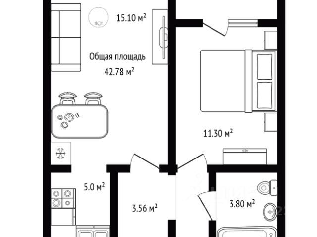 - Общая площадь 42.8 м2
