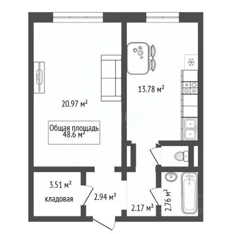 - Общая площадь: 48.6 м2
