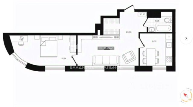 - Общая площадь 51.5 м2