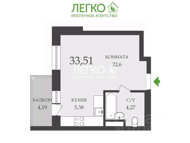 - Общая площадь 33.6 м2