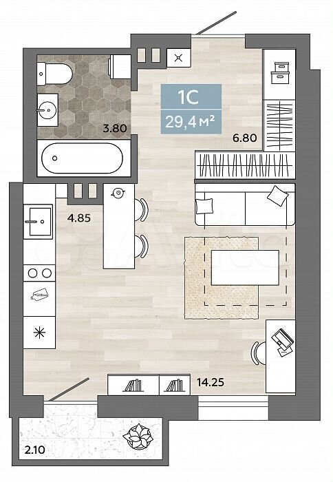 - Общая площадь 29.4 м2
