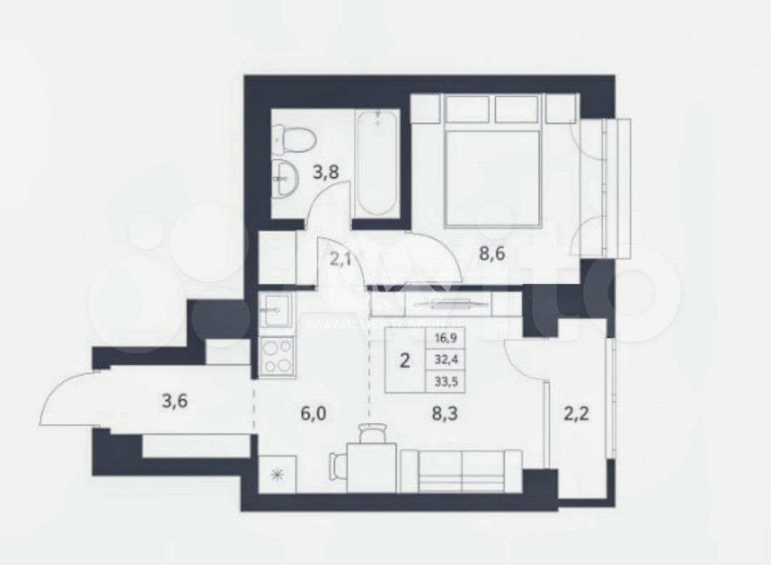 - Общая площадь 32.5 м2