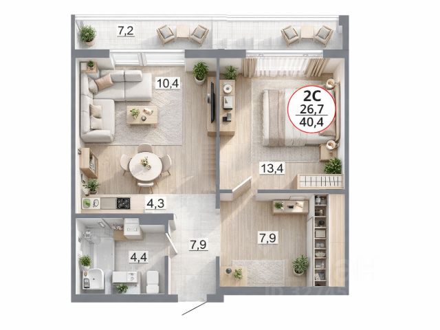 - Общая площадь: 40.5 м2