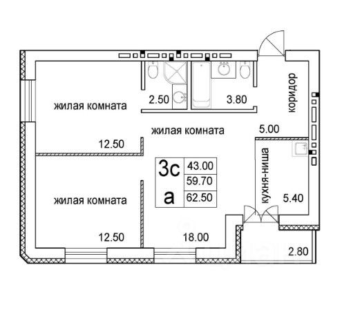 - Общая площадь: 62.5 м2