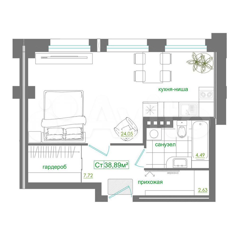 - Общая площадь 38.9 м2