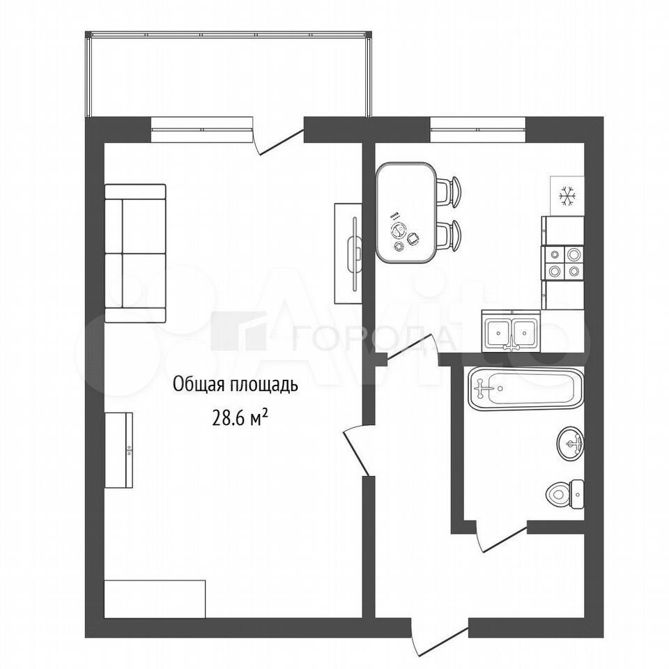 - Общая площадь: 28.6 м2