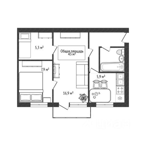 - Общая площадь 43 м2