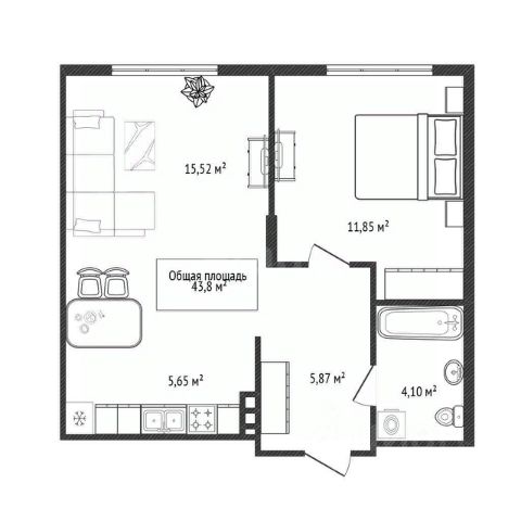 - Общая площадь 43.8 м2