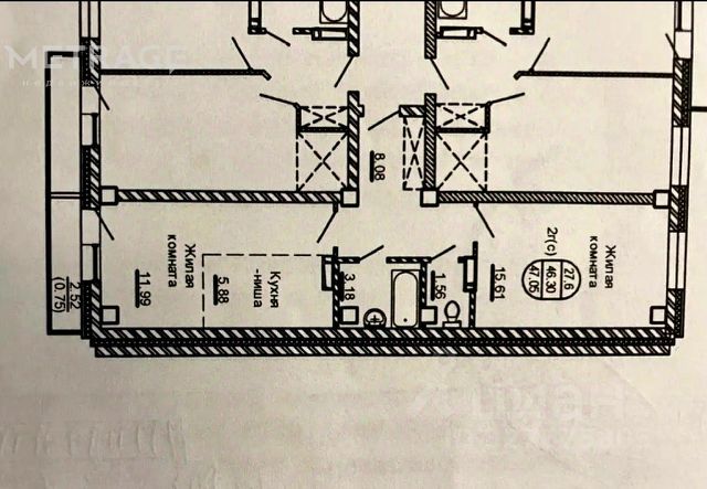 - Общая площадь: 46.6 м2