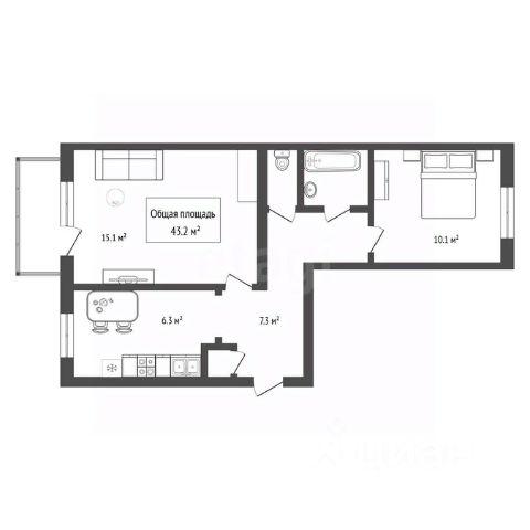 - Общая площадь: 43.2 м2