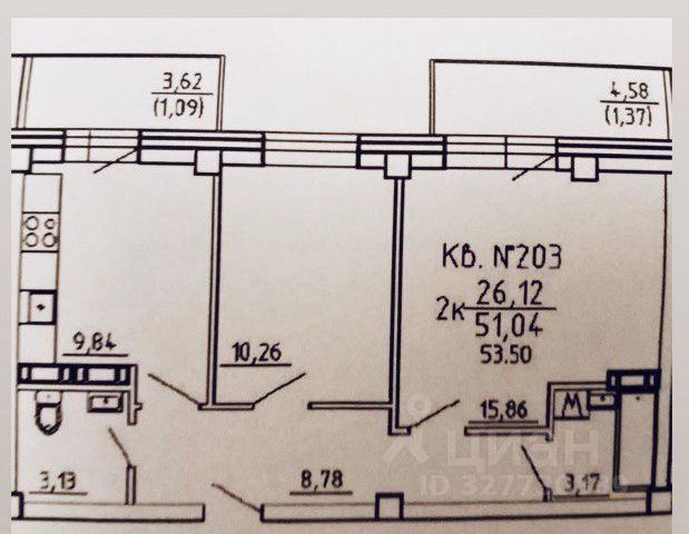 - Общая площадь: 53.5 м2