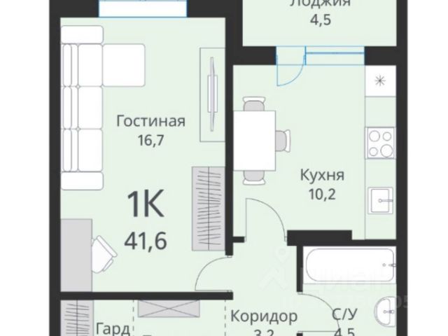 - Общая площадь: 41.6 м2