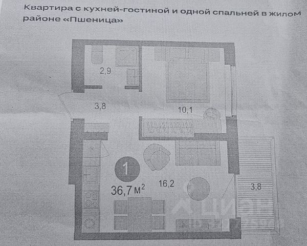 - Общая площадь 36.7 м2