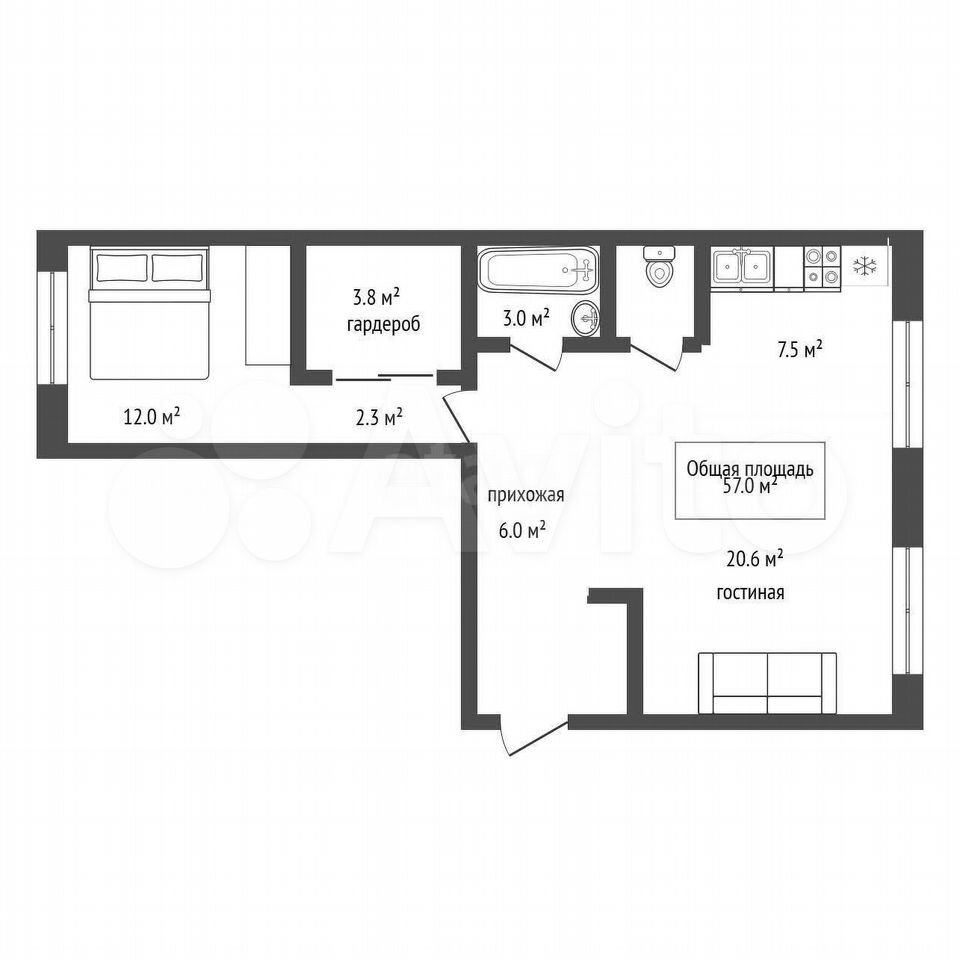 - Общая площадь: 57 м2