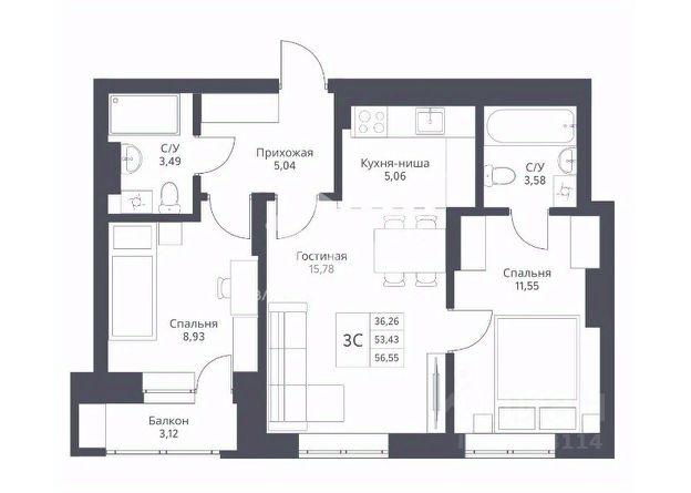 - Общая площадь: 53.4 м2