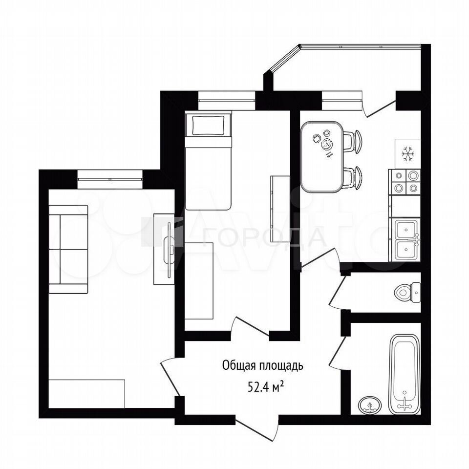 - Общая площадь: 52.4 м2