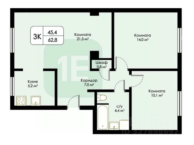 - Общая площадь: 62.8 м2