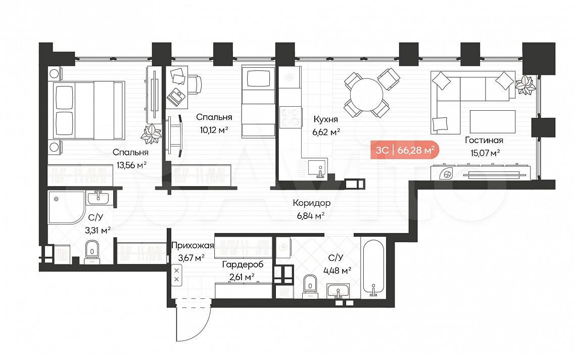 - Общая площадь: 66.3 м2