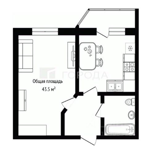 - Общая площадь 43.5 м2