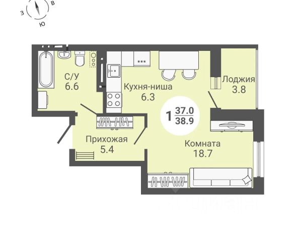 - Общая площадь: 36.6 м2