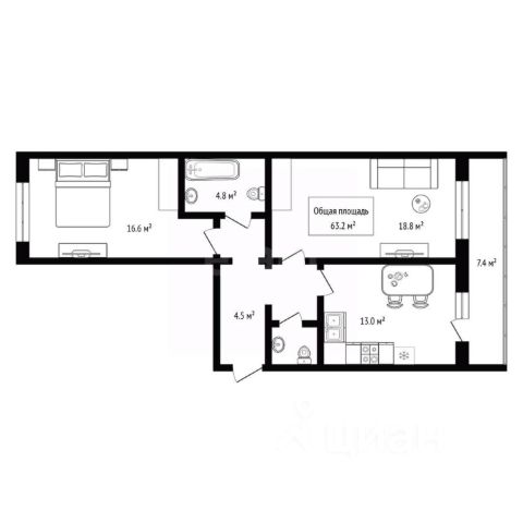 - Общая площадь: 63.2 м2