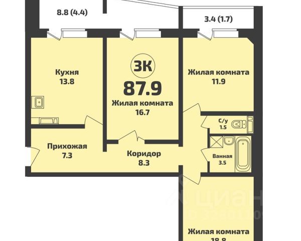 - Общая площадь 87.9 м2