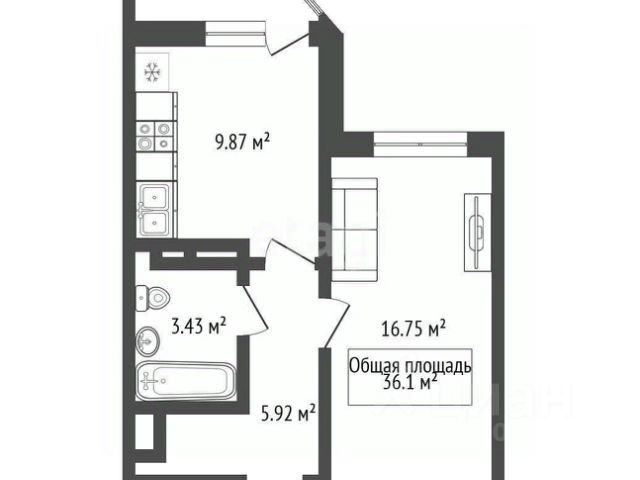 - Общая площадь 36.1 м2