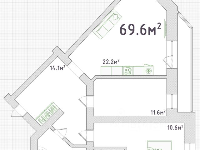 - Общая площадь: 69.6 м2