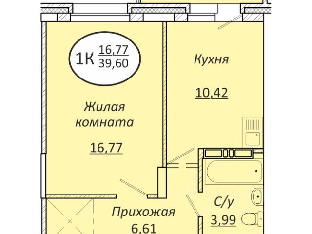 - Общая площадь 39.6 м2