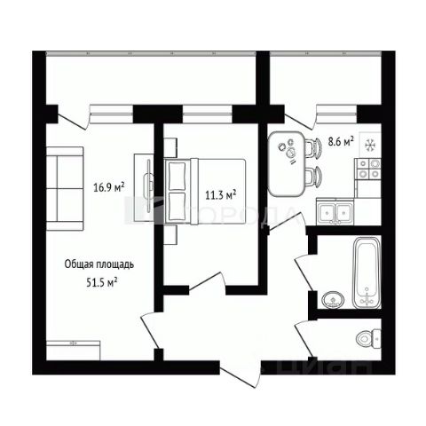 - Общая площадь: 51.5 м2