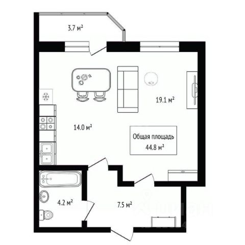 - Общая площадь 44.8 м2