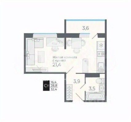 - Общая площадь 28.3 м2