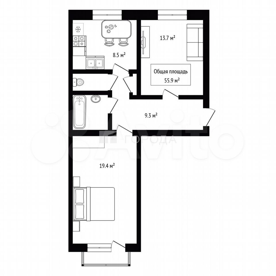 - Общая площадь: 55.9 м2