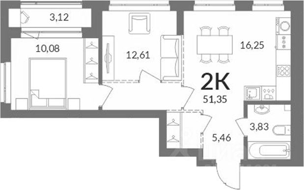 - Общая площадь 53.4 м2