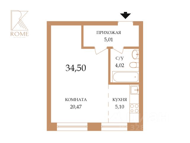 - Общая площадь 34.5 м2