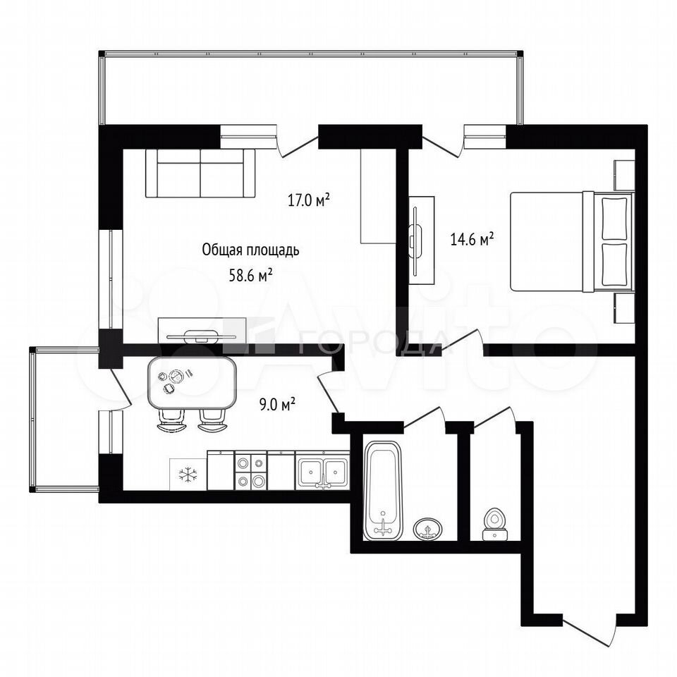 - Общая площадь: 58.6 м2