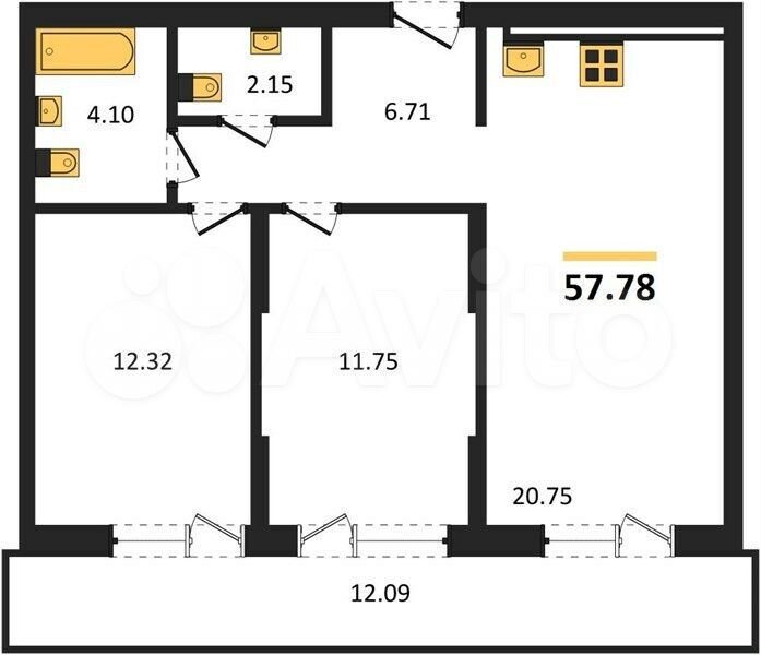 - Общая площадь: 57.8 м2