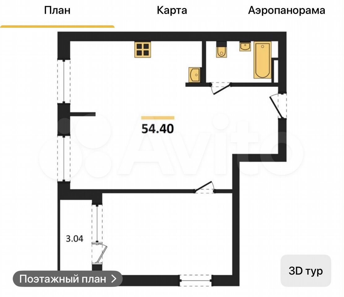 - Общая площадь 54.4 м2