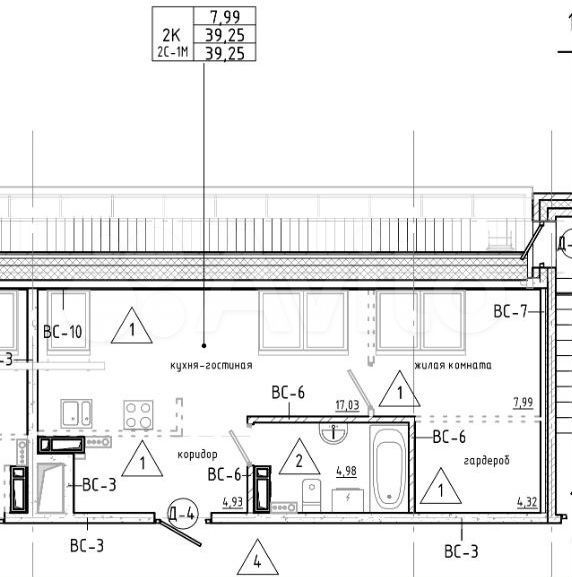 - Общая площадь 39.1 м2