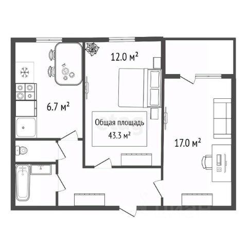 - Общая площадь 43.3 м2