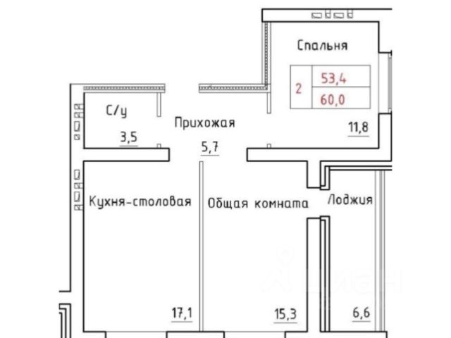 - Общая площадь: 53.5 м2
