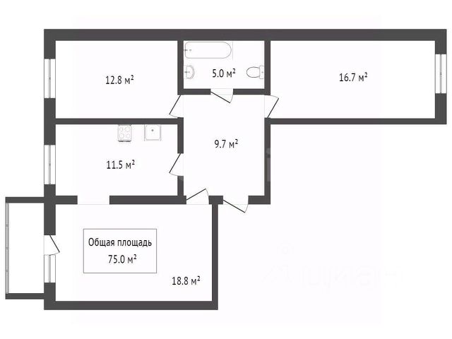 - Общая площадь: 74.6 м2