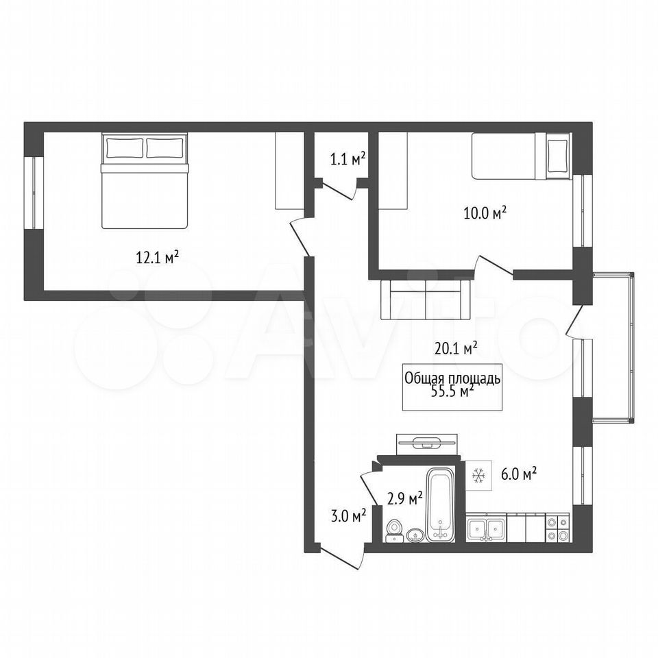 - Общая площадь: 55.5 м2
