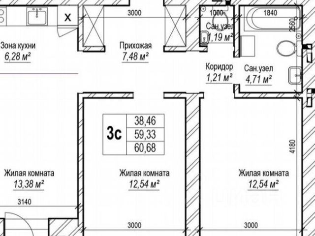 - Общая площадь: 60.1 м2