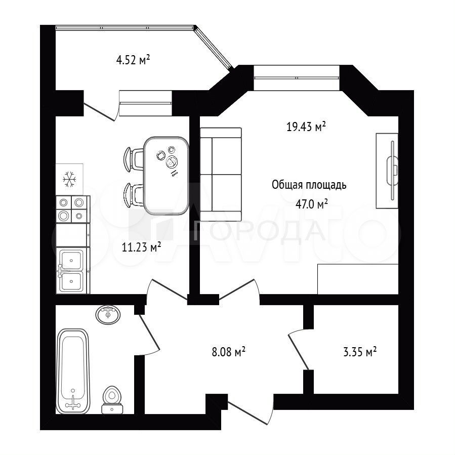 - Общая площадь 47 м2