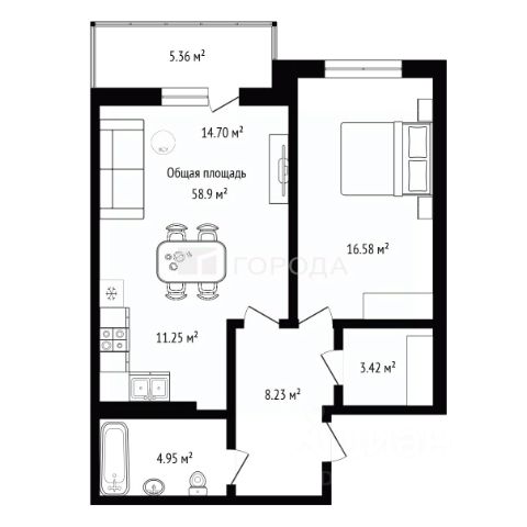 - Общая площадь: 58.9 м2