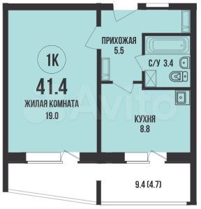 - Общая площадь: 41.4 м2